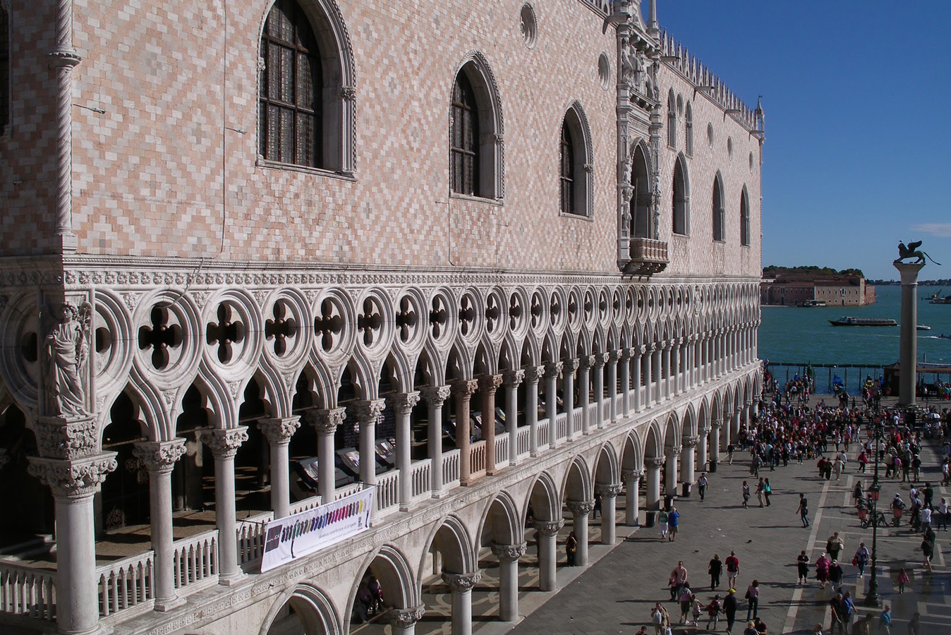 The historical center of state justice in Venice was the Doge’s Palace, on St. Marks Square. It has fabric-inspired brickwork, pedestrian-friendly Venetian Gothic colonnades, and lacy terra-cotta ornament. This lovely exterior’s grandeur does not, however, correlate with the harsh judgments and punishments that were imposed from within.