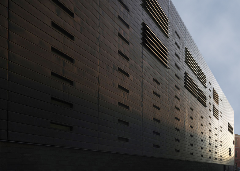 The dark form is clad in oxidized copper panels punctuated by narrow windows. The entry is recessed under a 15 foot overhang. The Law Court Offices’ light-absorbing, geometrically simplified presence would be remarkable in any setting. It stands apart, attracts attention for being different, and strikes a degree of trepidation into the viewer.