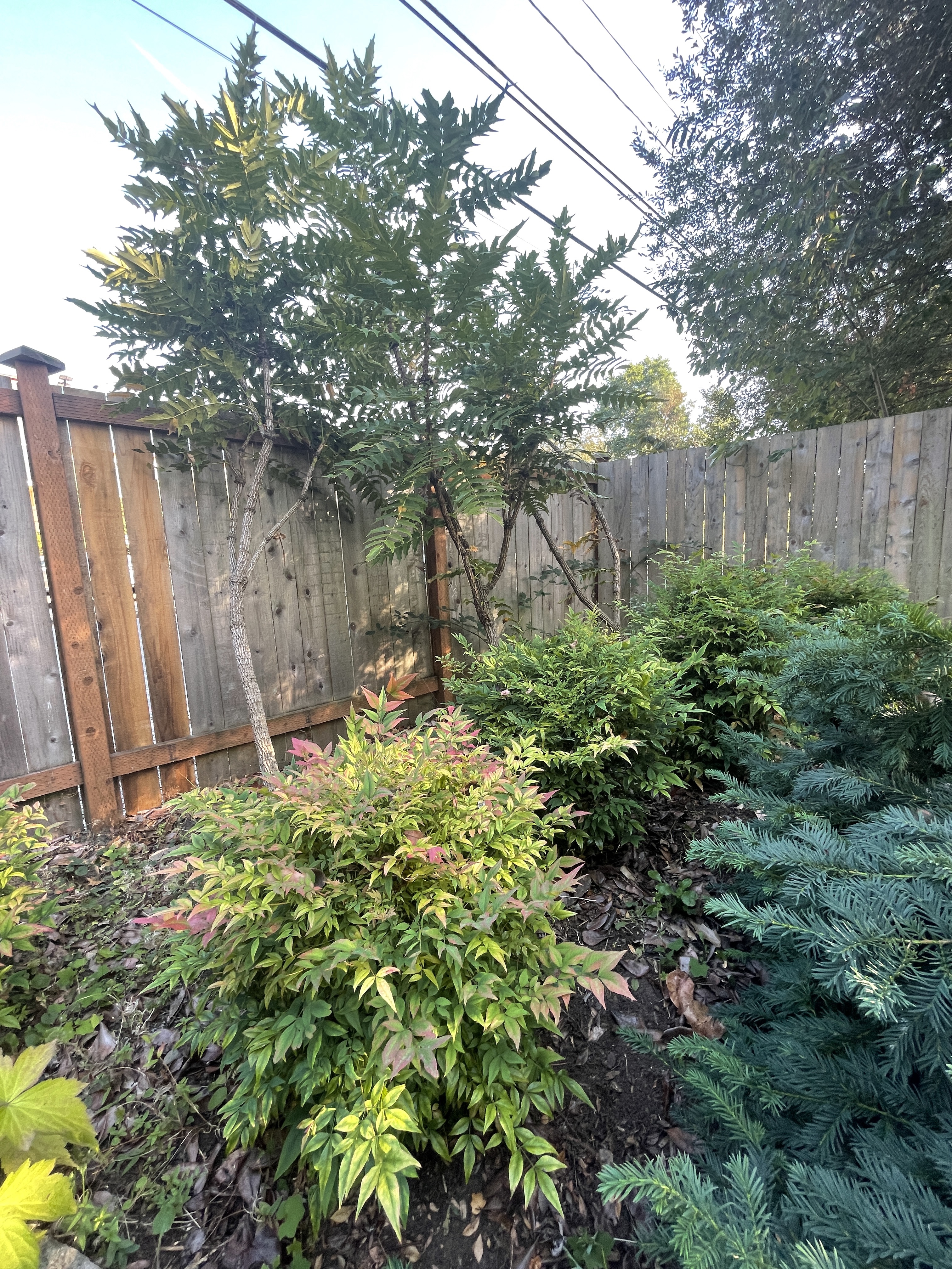 In the formerly neglected upper right corner, three tall prickly mahonias form a backdrop for a row of heavenly bamboos.